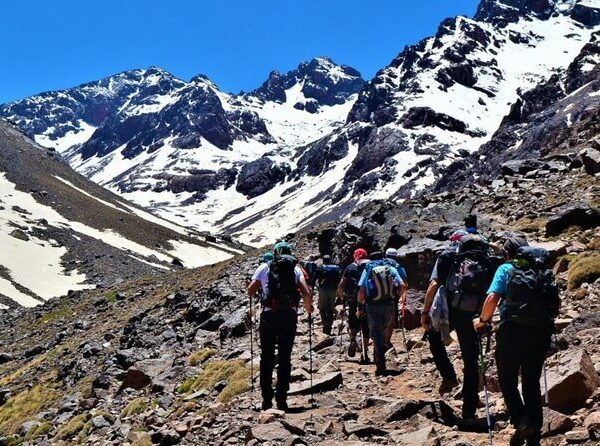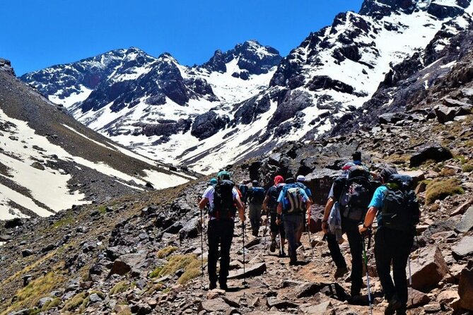 : Pick up from your hotel in Marrakech. After a transfer to the little village of Imlil we begin our trek. Heading along the Mizane Valley, we first pass the village of Aremd and then onto the shrine of Sidi Chamarouch. We then continue east and by crossing the flood plains our route takes us along mule tracks and up into the high rocky cliffs above the valley. Crossing the river we eventually come to the pastoral shrine of Sidi Chamarouch, which attracts tourists and pilgrims. From here the trail continues to climb steadily, snaking and zigzagging its way up to the snowline and the Toukbal Refuge (3206m), our stop for the night. Night in a tent nearby the refuge.