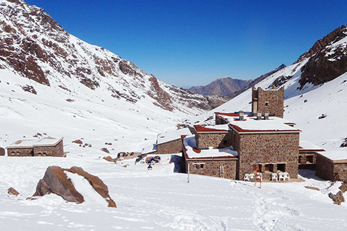 Heading along the Mizane Valley, we first pass the village of Aremd and then onto the shrine of Sidi Chamarouch. We then continue east and by crossing the flood plains our route takes us along mule tracks and up into the high rocky cliffs above the valley. Crossing the river we eventually come to the pastoral shrine of Sidi Chamarouch, which attracts tourists and pilgrims. From here the trail continues to climb steadily, snaking and zigzagging its way up to the snowline and the Toukbal Refuge (3206m), our stop for the night. Approx 5 hours walking.